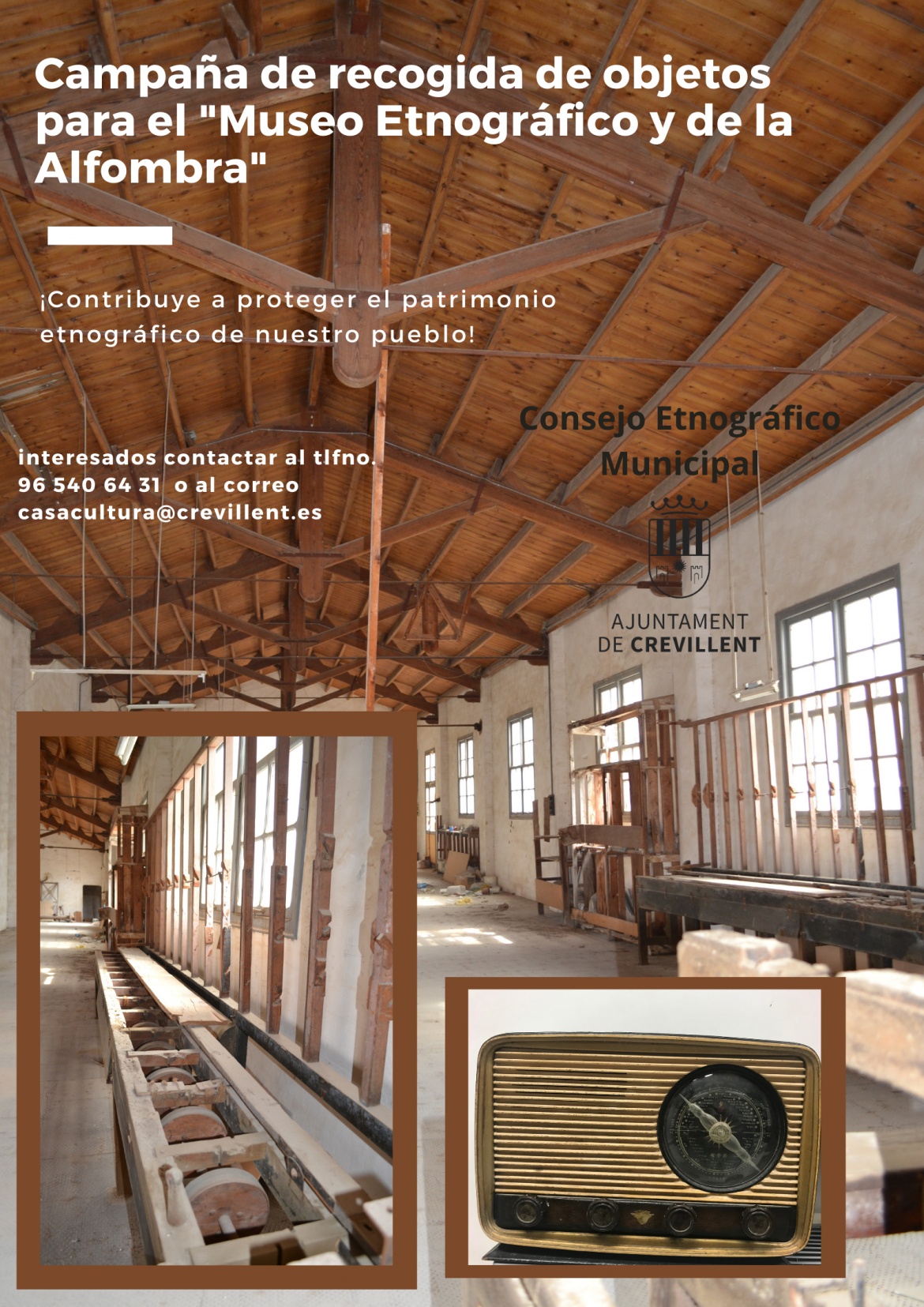 El Consell Etnogràfic Municipal en la seua última reunió va decidir llançar una campanya per a la recollida d’objectes, maquinària, documents… tot el relacionat amb els vells oficis, especialment de la catifa, així com amb les formes de vida de temps passats.