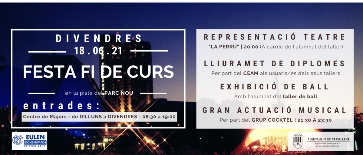 El Centre de Majors Parc Nou de Crevillent celebrarà la seua festa de fi de curs divendres 18 de juny al Parc Municipal. Un acte que inclourà la representació de l’obra de teatre “La Perru” a càrrec de l’alumnat, el repartiment de diplomes per part del CEAM (Centre Especial d’Atenció al Major) als usuaris i usuàries dels seus tallers, una exhibició de ball amb els alumnes i alumnes del taller de ball, i l’actuació del Grup Cocktel.
