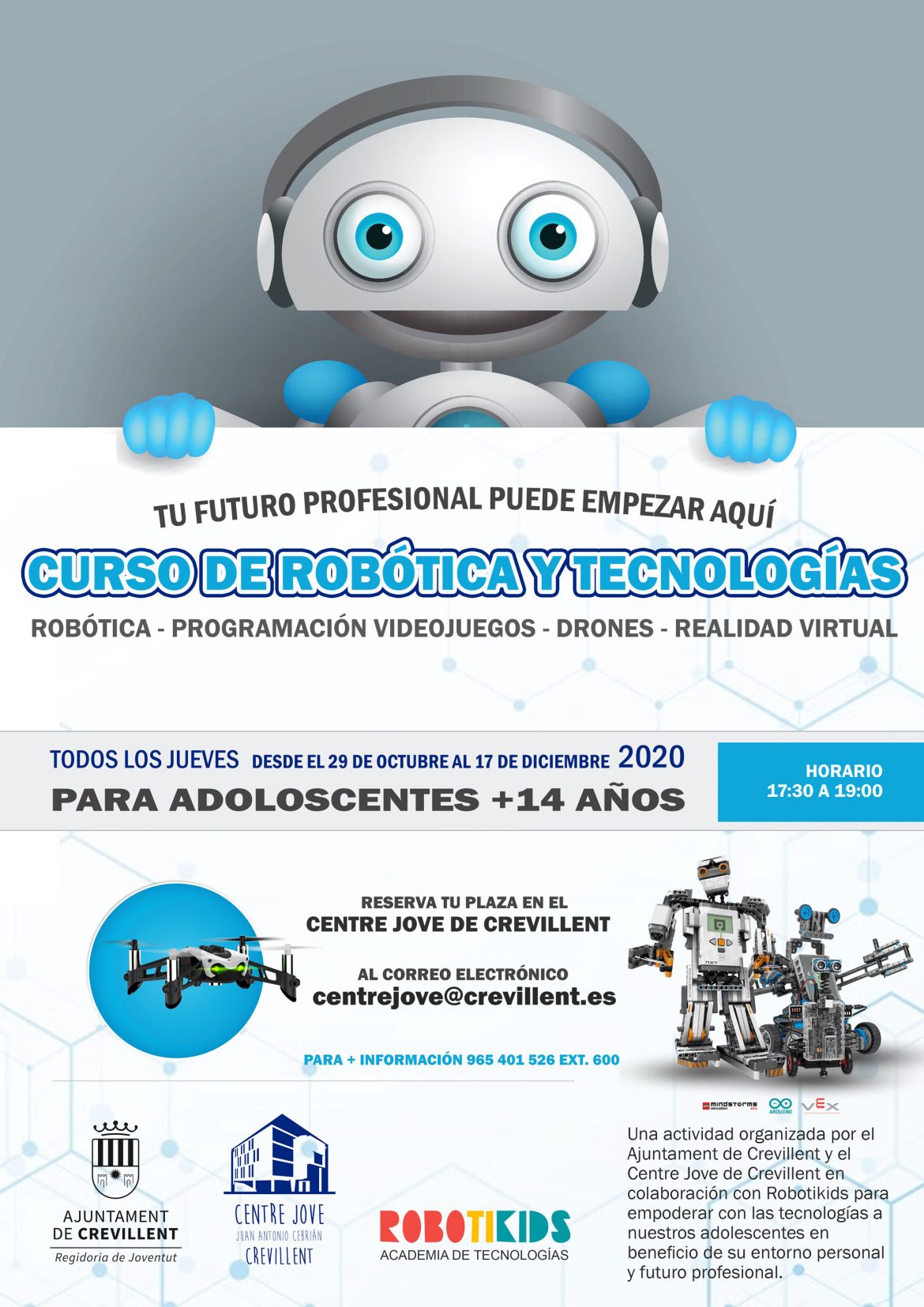 El Taller de Robótica será los jueves de 17:30 a 19:00h e incluye ocho sesiones: 4 de Robótica, 1 de Realidad Virtual, 2 de Programación de videojuegos y 1 de Drones. Dirigido a mayores de 14 años.